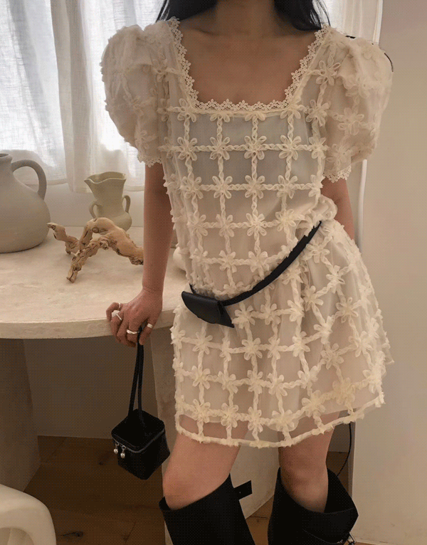 細緻花磚蕾絲公主袖洋裝 NT$2480 -