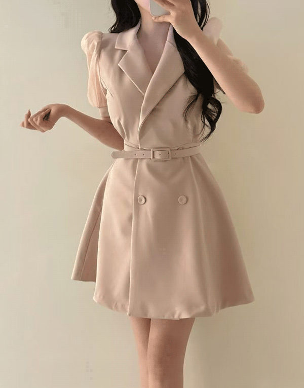 雪紡蓬袖西裝領雙排釦洋裝 NT$1680 -
