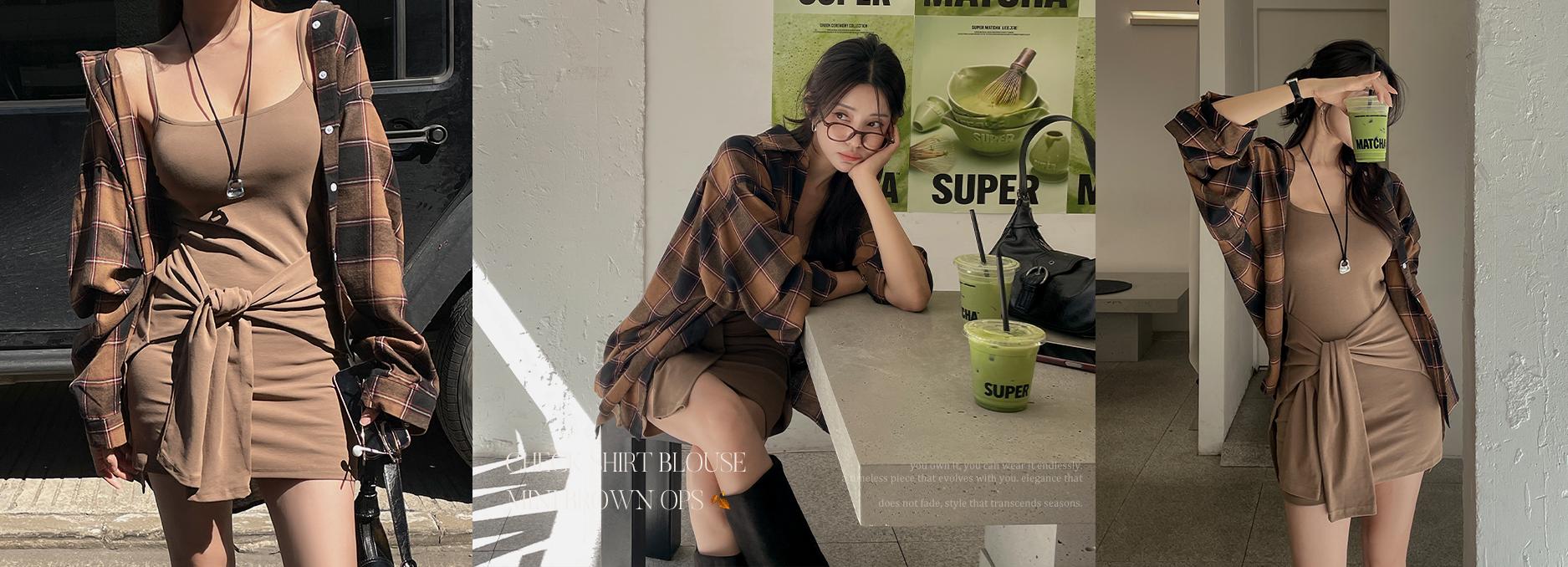 細肩帶腰綁帶短洋裝+格紋襯衫外套SET NT$1380 -