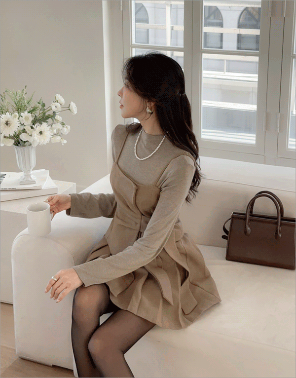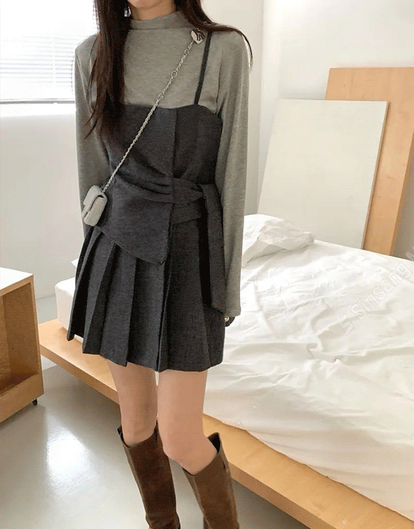 毛呢百褶綁帶背心裙+小立領彈力上衣SET NT.$1380 -