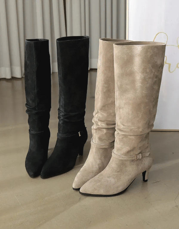 真麂皮皺摺繫帶高跟長靴 NT.$2380 -