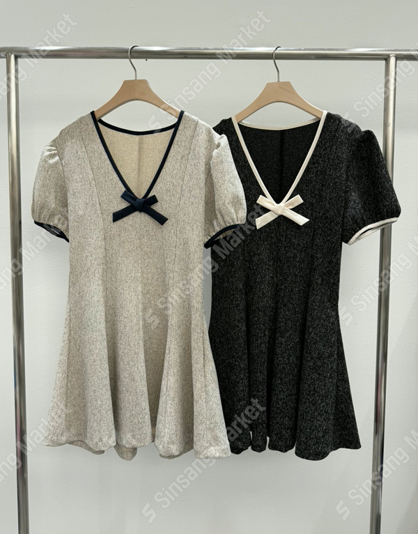 粗花呢蝴蝶結泡泡袖洋裝 NT.$1480 -